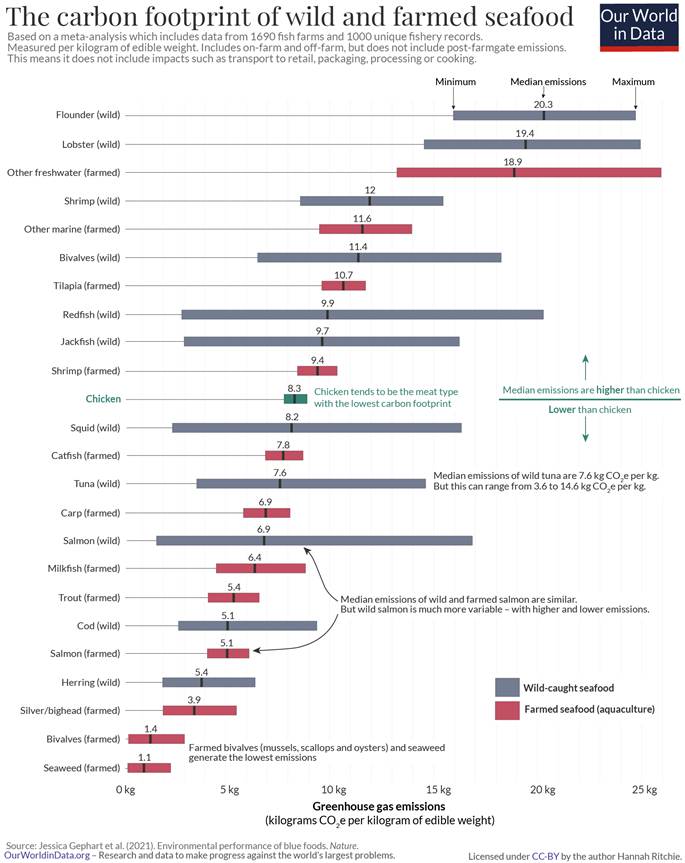 The carbon footprint of fish will be dependent on how it has been produced. Wild-caught fish are those that live and are harvested in their natural habitats, such as oceans, rivers and lakes. Farmed fish have been raised in controlled environments like fish farms. Farmed fish have much lower carbon footprint compared to wild fish, so it is a better choice.