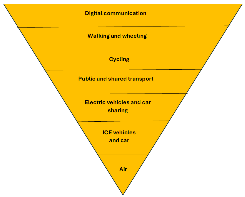 The reason why this option is at the top of the hierarchy is because choosing to have an online meeting rather than meeting up means you have avoided the need to travel from your home. This option creates zero carbon emissions and adds nothing to your carbon footprint. This is best choice if there is ever a need to be in contact with someone in a different place. If this is not possible, then the next best options are ‘active travelling’, which includes walking and wheeling; cycling and public and shared transport.